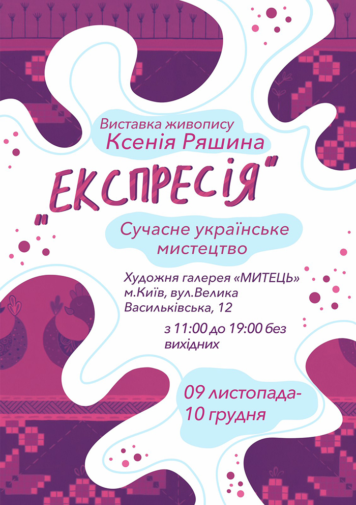 9 листопада в малому залі Художньої галереї КОНСХУ “Митець” відкривається виставка живопису Ксенії Ряшиної «Експресія».