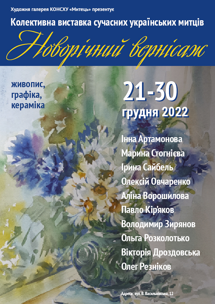 З 21 по 30 грудня 2022 р. в художній галереї “Митець” проходитиме колективна виставка сучасних українських митців “Новорічний вернісаж”.