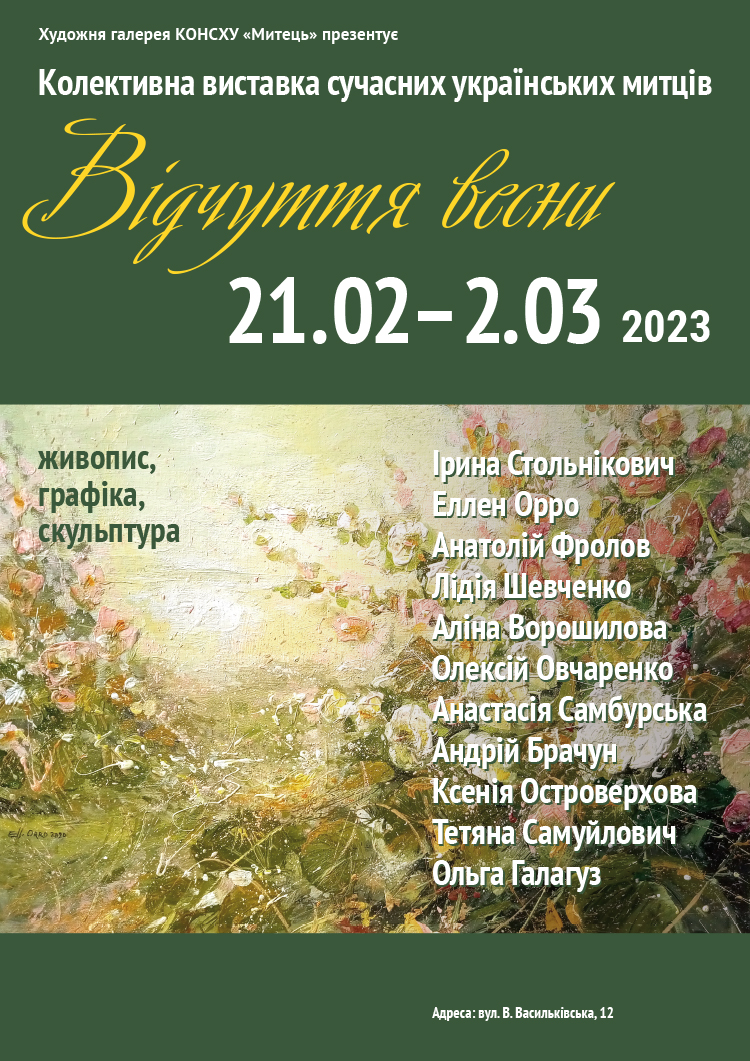 З 21 лютого по 2 березня 2023 р. в художній галереї КОНСХУ “Митець” проходитиме колективна виставка сучасних українських митців “Відчуття весни”.