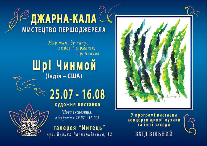 На виставці “ДЖАРНА-КАЛА” ви зможете побачити факсимільні репродукції з картин Шрі Чинмоя, всесвітньо відомого духовного майстра, філософа і поета, непересічного музиканта й художника, а також дивовижного атлета.