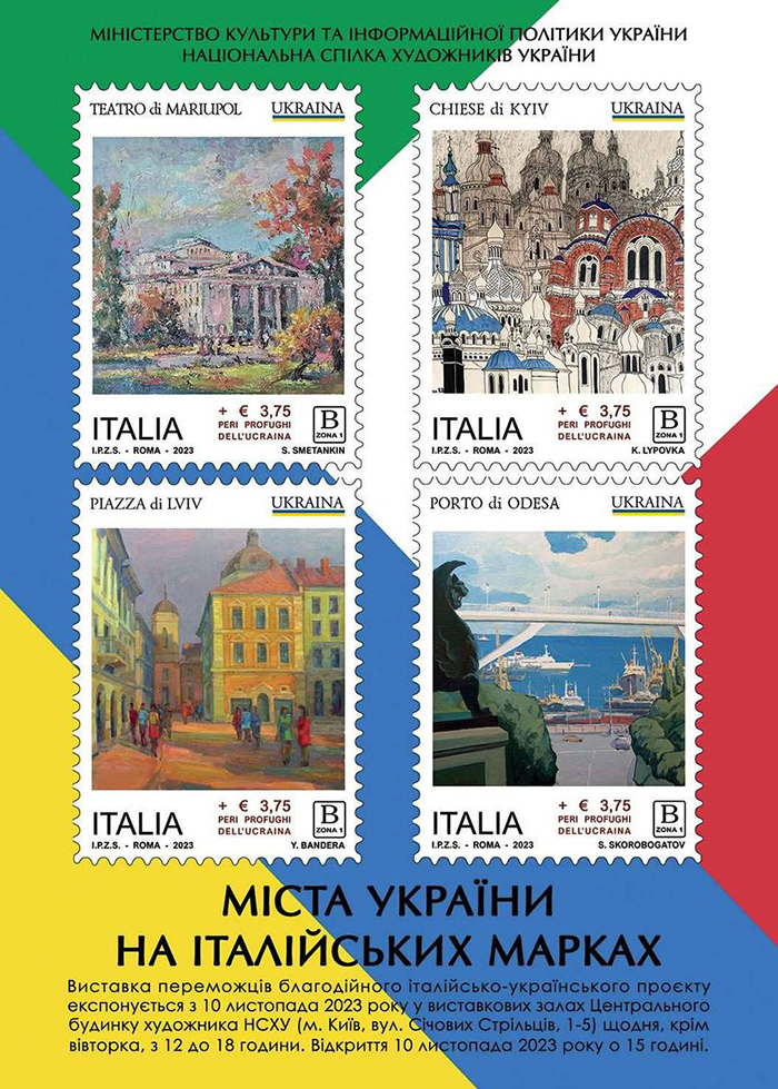 Виставка творів переможців конкурсу «Український художник для італійської марки», перекинула місток єдності між двома державами, як свідчення переваги гуманних цінностей над варварством. Картини членів Національної Спілки художників України – Катерини Липовки, Сергія Сметанкіна, Юрія Бандери, Святослава Скоробогатова та афіша з марками, друк яких відбувся на Італійському поліграфічному комбінаті цінних паперів, представлені для широкого загалу. Картини з храмами столиці «Київ. Простір варіантів», Маріупільский драматичний театр, центральна площа Львова «Захід сонця» та Одеський порт «Весняна гавань» віддзеркалені на марках, які представляє плакат.