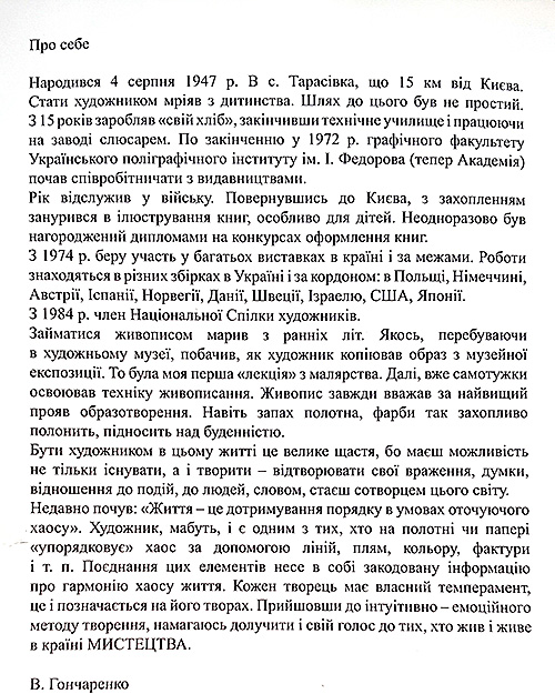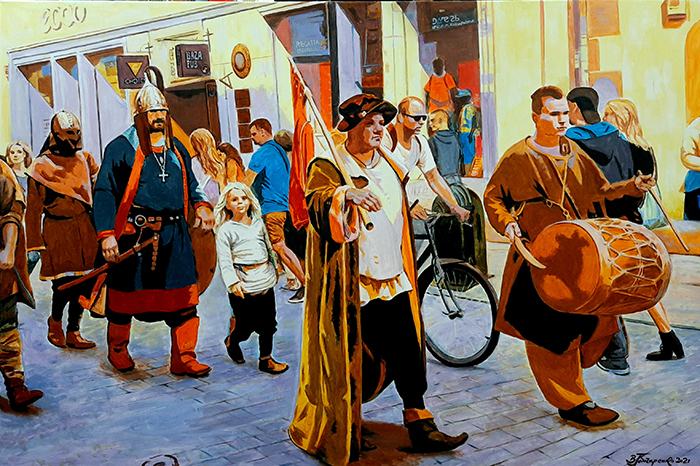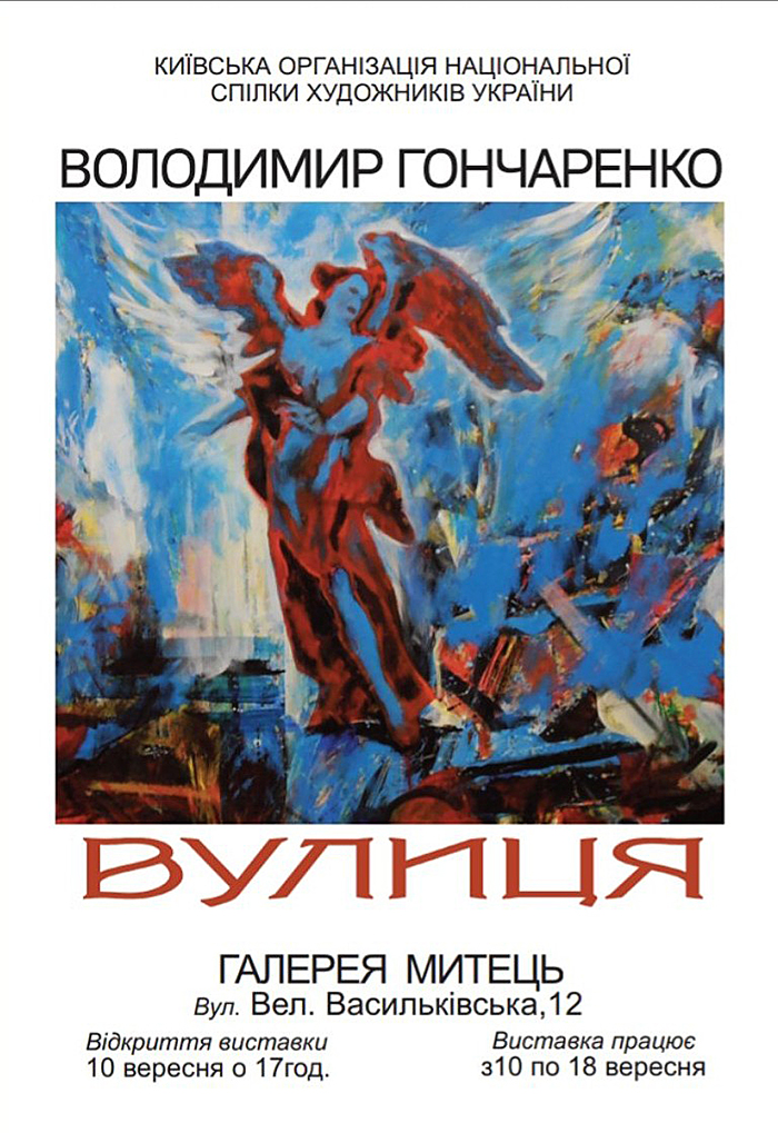Виставка творів Володимира Гончаренка «Вулиця». 10.09.2024 – 18.09.2024 Posted on 06.09.202406.09.2024 by @rchitect З 10 по 18 вересня 2024 року в Художній галереї «Митець» КОНСХУ буде проходити персональна виставка творів Володимира Гончаренка «Вулиця». З проєкту ВУЛИЦЯ. 2021, п.а.о., 90х150 З проєкту ВУЛИЦЯ. День. 2020, п.а.о., 90х150 Не дитячі забави. 2016, п.о., 100х120 Роверисти. 2016,100х120 ЕВОЛЮЦІЯ. 2018, 120х150 Старі. 2002, п.о.,100х80 Відкриття виставки 10 вересня о 17:00. Запрошуємо! Вхід вільний!